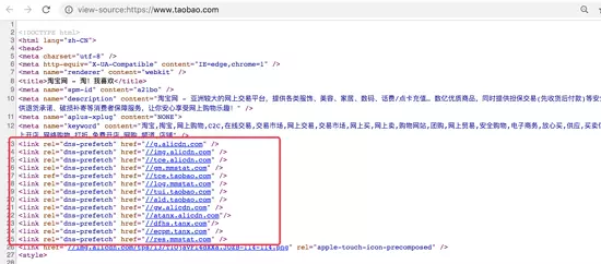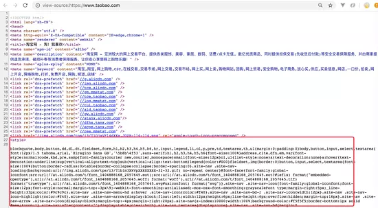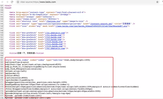 因此我们可以总结为:js 加载的时间 不等于 JsEndTime - JsStartTime;同理 js 加载和执行的实际 也不等于 JsEndTime - JsStartTime。正因为有外链 css 中的 http 请求,它会堵塞 js 的执行,因此很多网站会把外链 css 文件改成内联 css 文件代码,内联 css 代码是串行的。比如百度,淘宝官网等。下面我们来看下这两个网站的源码: