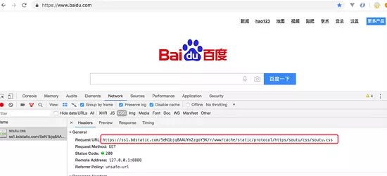 我们再来看下百度搜索页面的网络 css 的请求可以看到如下,同域名下根本就没有 css 外链操作,所有的 css 代码都是内联的,我们查看网络看到就仅仅有一个 css 外链请求,并且该 css 并不是百度内部的 css 文件,如下所示: