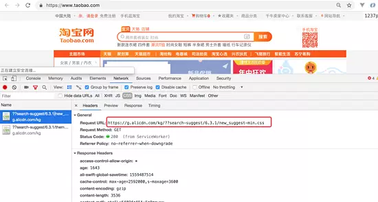 并且我们查看淘宝官网的网络请求中只看到两个 css 外链请求,且该两个外链请求并不是淘宝内部的同域名下的 css 请求,