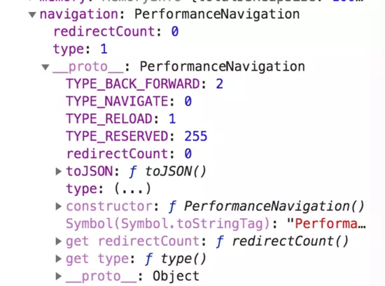- performance.navigation 含义是页面的来源信息,该对象有 2 个属性值,分别是:redirectCount 和 type。 - redirectCount:该值的含义是:如果有重定向的话,页面通过几次重定向跳转而来,默认为 0;