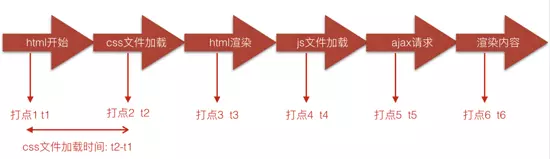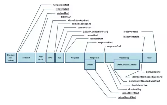 performance 对象有一个 timing 属性,该属性包含很多属性值,我们还是来看看之前的示意图,如下所示: