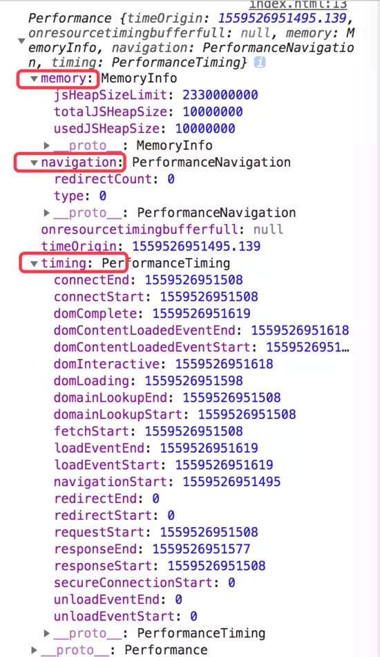 如上可以看到,performance 包含三个对象,分别为 memory、navigation、timing . 其中 memory 是和内存相关的,navigation 是指来源相关的,也就是说从那个地方跳转过来的。timing 是关键点时间。下面我们来分别介绍下该对象有哪些具体的属性值。