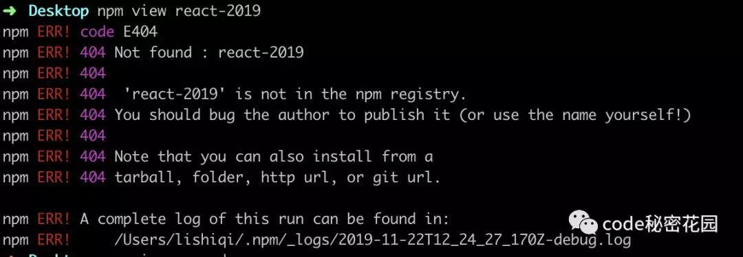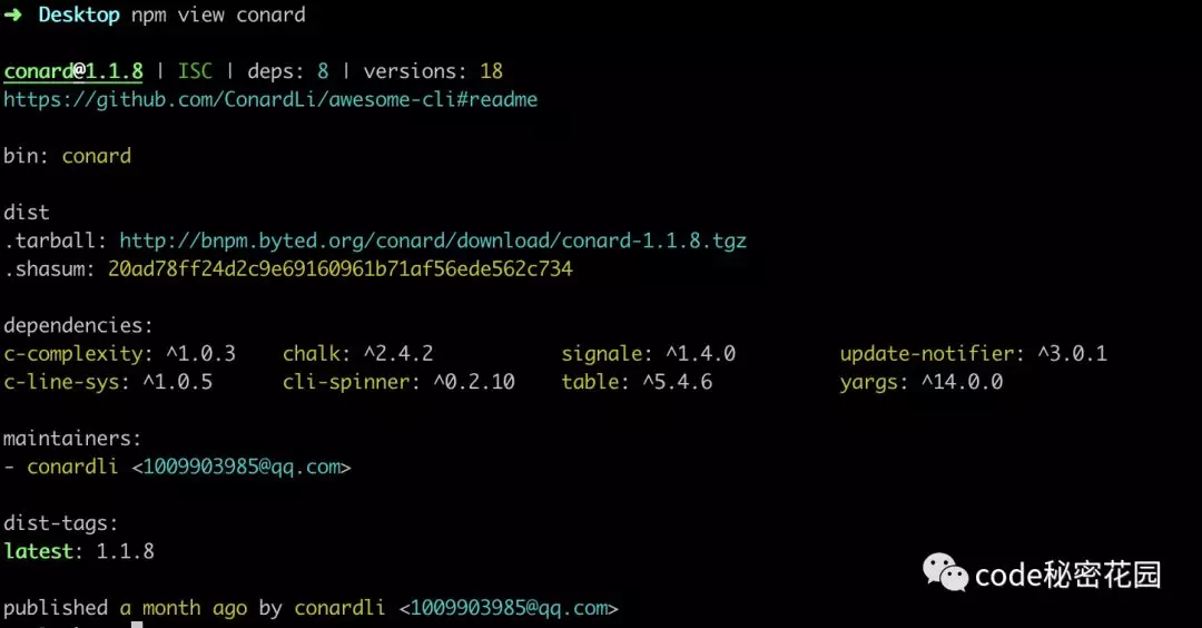 name 是一个包的唯一标识,不得和其他包名重复,我们可以执行 npm view packageName 查看包是否被占用,并可以查看它的一些基本信息:
