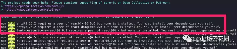 例如,我在项目中依赖了 antd 的最新版本,然后依赖了 react 的 15.6.0 版本,在进行依赖安装时将给出以下警告: