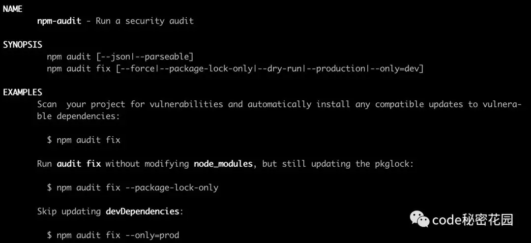 在命令行输入 man npm-audit :