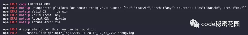 例如,我把一个测试模块指定一个系统黑名单:"os" : ["!darwin"],当我在此系统下安装它时会爆出如下错误: